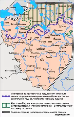 Основа языкового комплекса севернорусского наречия представляет черты, территориальное распространение которых отличается наибольшей определённостью и потому даёт основание для выделения данного диалектного объединения[63]. С этой основой при разработке языкового комплекса наречия были связаны черты (присущие севернорусскому наречию с синхронной точки зрения) с меньшей определённостью или с меньшей последовательностью распространения, но в целом укладывающиеся в пределы основного сочетания ареалов, выделяющих северное наречие русского языка[64].