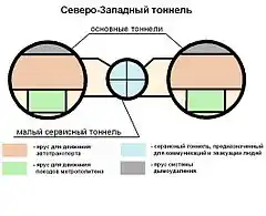 | Конструкция | двухъярусные тоннели, два основных + один сервисный |