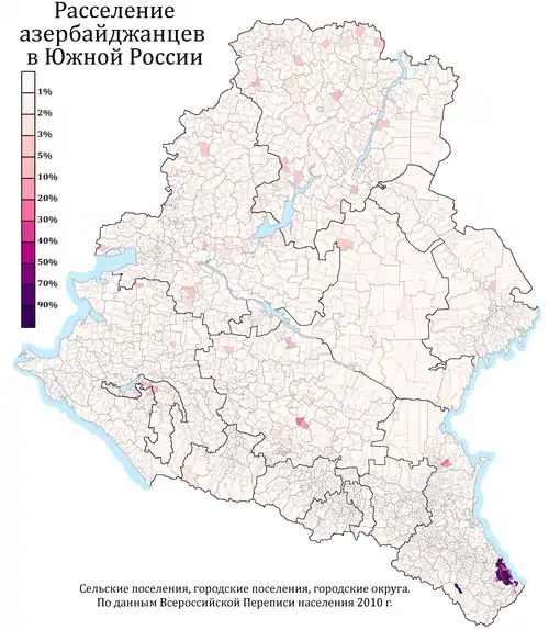 Расселение азербайджанцев в ЮФО и СКФО по городским и сельским поселениям в %, перепись 2010 г.
