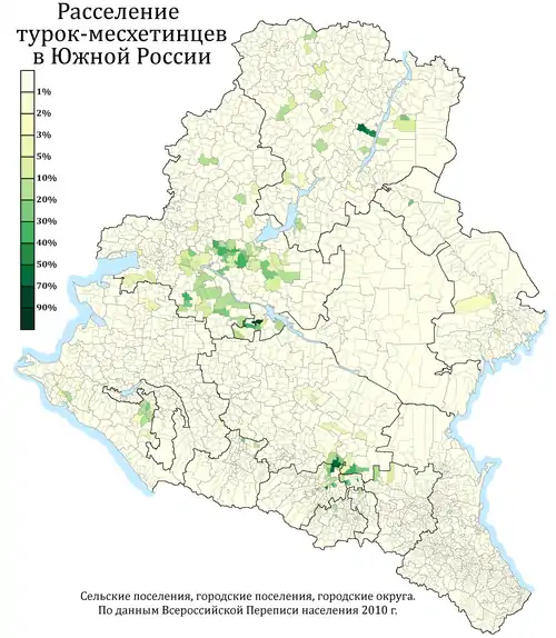 Расселение турок-месхетинцев в ЮФО и СКФО по городским и сельским поселениям в %, перепись 2010 г.
