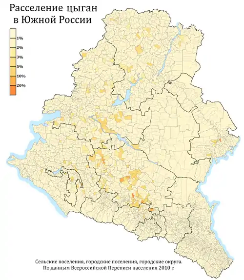 Расселение цыган в ЮФО и СКФО по городским и сельским поселениям в %, перепись 2010 г.