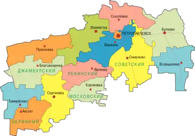 Область делится на 13 районов и 1 город областного значения — город Петропавловск: