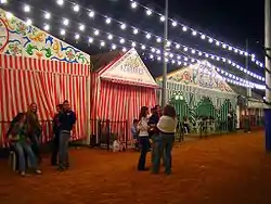 Во время праздника, ярмарочную площадь и берега Гвадалквивира украшают всячески декорированными палатками, называемыми касетас. Некоторые из них принадлежат знатным семьям, другие клубам, торговым ассоциациям, политическим партиям или просто группам друзей. Начиная примерно с девяти вечера до шести или семи часов утра сначала на улице, а затем в каждом из павильонов можно наблюдать гуляющих и танцующих традиционную севильяну, наслаждающихся хересом или мансанильей и тапасами.[1] Популярностью пользуется также коктейль ребухито.