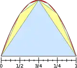 Архимед в III веке до н. э. доказал, что площадь сегмента параболы, отсекаемого от неё прямой, составляет 4/3 от площади вписанного в этот сегмент треугольника (см. рисунок).