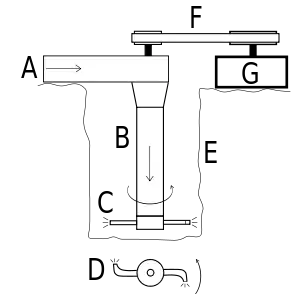 Сегнерово колесо: A — впуск воды, B — вертикальная трубка с ротором, C — ротор с форсунками (вид сбоку), D — ротор с форсунками (вид сверху), E — отверстие в дне, F — ременная передача, G — потребитель мощности