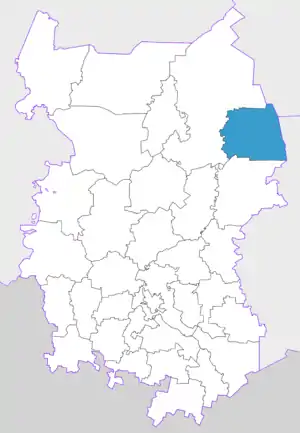 Район расположен в северо-восточной части Омской области. Граничит на востоке с Томской и Новосибирской областями, на юге — с Муромцевским, на севере и западе — с Тарским районами. Его площадь 522,1 тыс. гектаров. Если не считать необжитую часть, протяженность района с юго-востока на северо-запад около 160 километров, ширина — 35-40. Территория района расположена вдоль главной водной магистрали, реки Уй, в северо-восточной части области и входит в состав её северной зоны. На востоке район граничит с Томской и Новосибирской областями, на юге — с Муромцевским, на западе и севере — с Тарским районом Омской области.