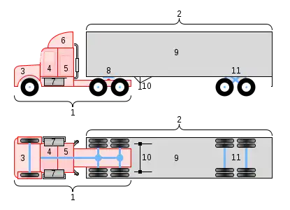 | Тягачи европейского типа чаще всего имеют 2 моста, три и более — гораздо реже. | Американские чаще всего имеют 3 моста, 2 из которых ведущие. |