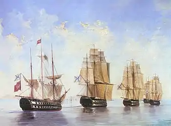 ![]() А. П. Боголюбов «Русский флот после Афонского сражения» (позади колонны на буксире линейного корабля «Селафаил» идёт пленённый турецкий корабль «Седель-Бахр») |