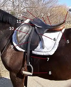 - Седельные подушки — набиты шерстью или синтетическим материалом[5]. Седло не должно касаться позвоночника лошади, поэтому пространство между подушками должно быть достаточно широким[6].