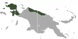 Встречается в северных прибрежных районах (в том числе горы Фойя) острова Новая Гвинея (Индонезия и Папуа-Новая Гвинея). Он живёт также на соседних островах Япен, Вайгео, Мисул, Салавати и, возможно, Батанта. Населяет низменные и горные тропические леса на высоте от 100 до 1400 метров над уровнем моря. Встречается как в первичных, так и в деградированных лесах.