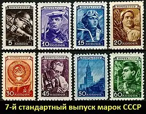 Седьмой стандартный выпуск стал первым послевоенным. Он появился в мае 1948 и издавался до сентября 1954 года. Серия состояла из марок восьми номиналов. На миниатюрах художник Василий Завьялов изобразил: шахтёра (5 копеек), моряка (10 копеек), лётчика (15 копеек), колхозницу (20 копеек), Герб и флаг СССР (30 копеек), учёного (45 копеек), Спасскую башню Московского кремля (50 копеек) и солдата-пехотинца (60 копеек). Впервые стандартная серия была отпечатана способом глубокой печати[1][2][3].