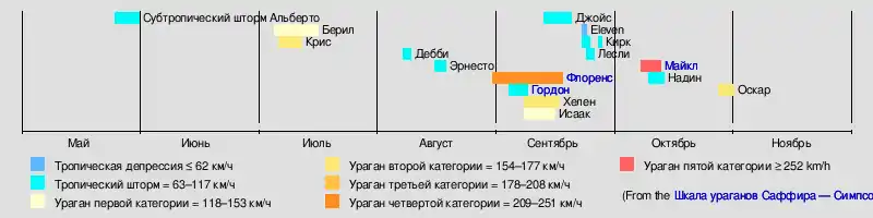 28 августа NHC сообщил о вероятности формирования тропических циклонов из тропической волны, выходящей в океан от побережья Западной Африки[52]. Через два дня такая волна перешла с побережья Сенегала в акваторию Атлантического океана, формируя грозы[53] и ясно видимую на синоптических картах зону низкого давления[54]. Так как к вечеру 30 августа циклон начал угрожать островам Кабо-Верде NHC начал выпускать информационные сообщения о потенциальном тропическом циклоне №6[55]. В полночь 1 сентября циклон усилился до тропической депрессии[56], а утром - до тропического шторма, получившего имя Флоренс. Шторм постепенно усиливался, перемещаясь на север-северо-запад и к 18 часам 4 сентября он стал третьим ураганом сезона[57], а за следующий день, испытав эффект быстрого усиления урагана[58], он достиг 4 категории[59], причем сделал это северо-восточнее всех известных ураганов, наблюдавшихся при помощи метеорологических спутников[60]. Сразу после этого взрывного усиления ураган попал в зону сильного сдвига ветра[61] и начал быстро слабеть, и за 30 часов Флоренс ослабел до тропического шторма[62]. 9 сентября тропический шторм вошел в зону с теплыми поверхностными водами и слабым сдвигом ветра[63] и снова начал быстро набирать силу[64] - к 19 часам 10 сентября ураган вновь достиг четвертой категории[65]. К моменту выхода на сушу у урагана начался цикл замены глаза, что ослабило его до второй категории[66], но никак не могло уменьшить количества воды, который нес этот атмосферный вихрь, так в отдельных регионах США было отмечено выпадение до 913 мм осадков, что обновило рекорд штата Северная Каролина и является 8 результатом в современной истории США[67]. Циклон ослаб до тропической депрессии 16 сентября [68], на следующий день он ослаб до остаточного минимума[69], а 19 сентября окончательно рассеялся над Атлантическим океаном[70]. Ураган нанес ущерб на сумму не менее 16.7 млрд. долларов США[71] и погубил 53 человека[72].