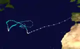 11 сентября NHC начал мониторинг внетропической области низкого давления вблизи побережья Африки[98]. К полуночи 12 сентября циклон усилился до субтропического шторма[99], получившего имя Джойс. 13 и 14 сентября шторм взаимодействовал с ураганом Хелен, что вызвало изгиб траектории шторма из-за эффекта Фудзивары[100]. К 6 утра 14 сентября Джойс стал тропическим штормом[101] и начал смещаться к востоку[102], а вечером - начал ослабевать. Уже к 18 часам 16 сентября циклон ослаб до тропической депрессии[103], а к утру 19 сентября он превратился в остаточный минимум[104].