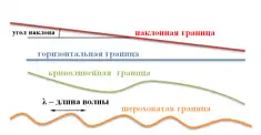 - горизонтальные — имеют угол наклона точно или приближённо равный 0. Нестрого горизонтальные границы, у углом наклона не более (2-5)0 называются субгоризонтальными.