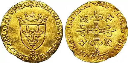 Золотой Экю с секретной точкой и буквенным обозначением под щитом, Франциск I