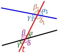 | Восемь углов трансверсали. (Вертикальные углы такие, как и всегда равны.) |