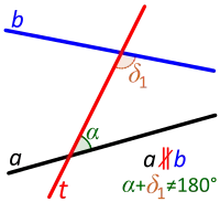Трансверсаль между непараллельными прямыми. Внутренние не накрест лежащие углы не являются дополнительными (в сумме дающими 180 градусов). |