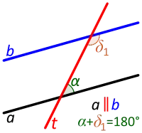 Трансверсаль между параллельными прямыми. Внутренние не накрест лежащие углы являются дополнительными (в сумме дающими 180 градусов). |