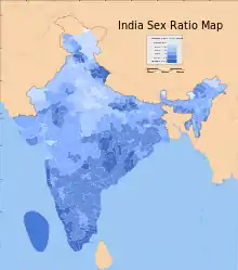 Согласно переписи населения 2001 года, в Индии на 100 девочек до 6 лет приходилось 108 мальчиков. В 2011 году доля мальчиков составляла уже 109 (919 девочек на 1000 мальчиков)[20]. Однако такой показатель сильно разнится в зависимости от региона и прямо зависит от уровня жизни населения и развитости регионов. Например, на 100 девочек в Харьяне приходится 120, Пенджабе — 118, Джамму и Кашмире — 118[21]. Однако имеет место быть информации, что общенациональные данные переписи населения сознательно занижают цифры и доля селективных абортов гораздо выше, так как в ряде бедных регионов, где население не имеет доступа к инфраструктуре и медицинским учреждениям, государство не способно вести достоверные статистики[22][23]. Коэффициент рождаемости мальчиков в регионах, где население состоит из дравидов гораздо ниже, чем в северных регионах Индии, доля мальчиков составляет 103—107, такие цифры ещё считаются не выходящими за пределы «естественного полового распределения» (доля новорождённых мальчиков всегда немного выше и без намеренного вмешательства). Однако регионы с преобладанием индо-арийских народов имеет наоборот очень высокий коэффициент рождаемости мальчиков, что очевидно говорит о высоким проценте абортов и детоубийства.