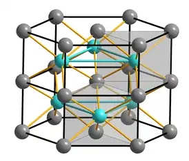 - при стехиометрическом составе — гексагональная сингония, пространственная группа P 63/mmc, параметры ячейки a = 0,36613 нм, c = 0,33562 (0,53562) нм, Z = 2;