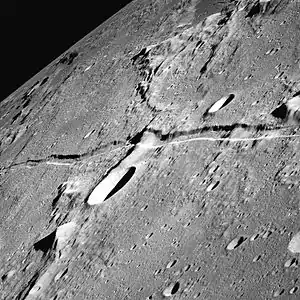 Также на поверхности Луны выделяют так называемые лунные борозды. В отличие от трещин, они напоминают русла высохших рек. Они относительно неглубоки, извилисты, имеют плоское дно и сглаженные берега.
