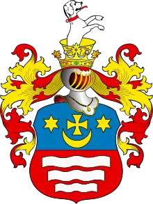 Щит разделён горизонтально на две части, из коих в верхней в голубом поле означены золотом две шестиугольные Звезды, между ними Крест и под ними Полумесяц, рогами вверх обращённый (польский герб Шелига). В нижней части в красном поле три речки, серебром означенные (польский герб Корчак).