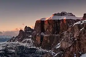 ![]() Закат, освещающий Пиц Чиавазес (2828 м), в массиве Селла | |