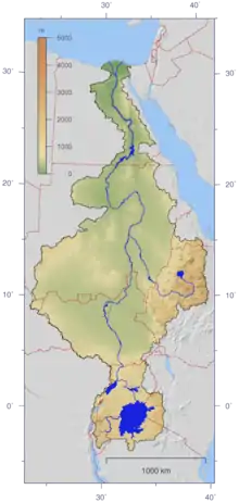 Длина реки Нил определена в 2016 году в 6 852 км, что ставит её на первое место по длине в мире (Амазонка — самая большая по объёму)[4]. Главный источник воды — озеро Виктория. Оттуда река течёт на север и впадает в Средиземное море. Исток реки тяжело определить с полной уверенностью, и считается, что он располагается в лесу Ныунгве в Руанде. Река проходит через 9 стран и множество различных местностей, включая пустыни, болота, тропические леса и горы. У Нила есть два главных притока: Голубой Нил, который берёт начало в Эфиопии, и Белый Нил, который происходит из Руанды. В то время как Белый Нил считается длиннее и легче для передвижения, Голубой Нил несёт примерно две трети объёма воды реки. Название притоков происходит от цвета воды, которую они несут. Притоки соединяются в Хартуме, а устье в Египте снова разветвляется, образуя дельту Нила[5].