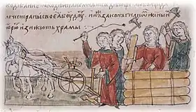 Оригинальный текст (церк.-сл.)[показатьскрыть]И поча думати и начаша глаголати дружина Святополча: «Не веремя веснѣ воевати: хочемь погубити смерды и ролью имъ». И рече Володимеръ: «Дивно ми, дружино, оже лошади кто жалуеть, еюже ореть кто, а сего чему не расмотрите, оже начьнетъ смердъ орати, и половчинъ приѣха, ударить смерда стрѣлою, а кобылу его поиметь, а в село въѣхавъ, поиметь жену его и дѣти, и все имѣнье его возметь. То лошади его жалуешь, а самого чему не жалуешь?»[4].