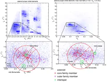 В результате статистического анализа[1] параметров орбит астероидов семейства Весты был установлен основной диапазон орбитальных элементов астероидов данного семейства: