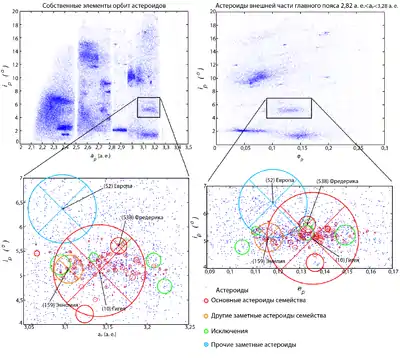 Крупный астероид (52) Европа размером более 300 км, имеющая орбиту с под наклоном 6,37 °, располагающуюся примерно в той же области, так же когда то рассматривалась как возможный член семейства, но последующие исследования показали ошибочность этого предположения. Уточнение границ семейства, которое удалось достигнуть в последнее время, показало, что она лежит далеко за пределами этих границ.
