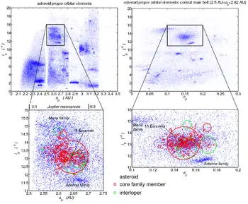 Астероиды семейства Эвномии движутся в области пространства, ограниченной орбитальными резонансами с Юпитером 3:1 и 8:3, при относительно высоком наклоне орбит.