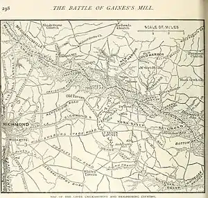 Это крупное сражение (англ. Battle of Gaines’Mill) иногда называют Первым сражением при Колд-Харбор или Сражением на Чикахомини. Утром армия Ли начала самое массовое наступление за всю войну — в нём участвовало 57 000 человек в составе шести дивизий.