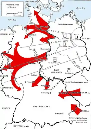 Советские планы предполагали выход на рубеж Северного моря и города Лиона (Франция) на девятый день наступления, затем продолжение наступления до конечного рубежа в Пиренеях. При этом некоторые союзники СССР по ОВД (например, Чехословакия) находили такие цели слишком оптимистичными. По мнению современных западных стратегов, цели советской операции были полностью недосягаемыми. У СССР имелись также планы по морской операции в Северной Атлантике против судоходства НАТО.