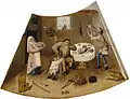 - Чревоугодие — тучный мужчина жадно поедает всё, что ставит на стол хозяйка, и не даёт поесть своему не менее тучному сыну. Его сосед жадно опустошает кувшин.