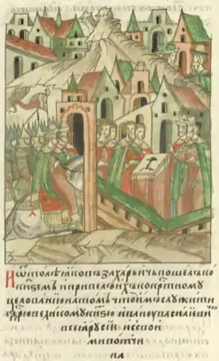 ![]() Семён Стародубский и Василий Шемячич целуют крест Ивану III | |
