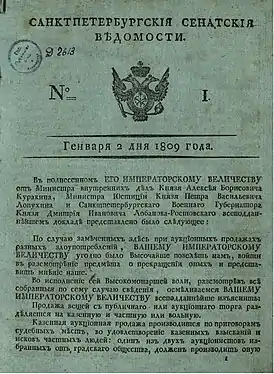 ![]() Первый номер «Сенатских ведомостей» от 2 января (14 января) 1809 года (хранится в отделе газет Российской национальной библиотеки). | |