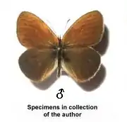 Длина переднего крыла от 15—17 (самцы) до 16—19 мм[2] (самки). Переднее крыло сверху тёмное, в центральной области ржаво-коричневое, с широким коричнево-бурым затемнением по внешнему краю. Заднее крыло сверху коричнево-бурое, однообразно окрашенное по всей поверхности, иногда с 1—3 мелкими глазчатыми пятнышками. В анальной половине внешнего края проходит более-менее заметный узкий охристый штрих. Нижняя сторона переднего крыла светлая, охристо-коричневая, с широкой белесовато-серой расплывчатой каймой по внешнему краю, заднего крыла — коричневато-серая с 1—2 чисто белыми пятнами неправильной формы и 5—6 мелкими глазчатыми пятнами, центрированными блестящими чешуями; по краю проходит очень тонкая, матово блестящая линия. Половой диморфизм выражен слабо — самка крупнее, рисунок, особенно на нижней стороне заднего крыла, развит сильнее, а сами глазчатые пятна крупнее и чётче.