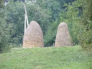 С целью уменьшить потери при сушке сена и вместе с тем предупредить вредное влияние на его качество ненастной погоды поступают по-разному. Иногда применяются совместно оба указанные выше способа приготовления сена. Тогда просушенную наполовину траву складывают более плотно в довольно высокие кучи, в которых оно и лежит до наступления ясной погоды, когда копны разбрасываются и сено скоро просыхает вполне, так как в кучах оно уже успело согреться. Обыкновенно же применяют другие предупредительные меры, заключающиеся в том, чтобы скошенную траву как можно менее тревожить и если переворачивать, то не часто и по возможности осторожно. Растения с прочным и прямым стеблем можно связывать для этой цели в бабки или образовывать из них двускатные шатры, как это делается при уборке на семена клевера и других сеяных трав. Для сушки же других растений, особенно же для широколиственных, можно пользоваться приспособлениями, устраиваемыми из кольев и жердей. Приспособлений таких очень много. Самые простые из них — козлы. Это колья, заострённые внизу, с пробитыми в них крестообразно поперечинами. Они вбиваются в землю, и на них навешивается несколько провялившаяся трава, досушиваемая проникающим сквозь сложенную растительную массу ветром; совершенно свежие растения слишком слеживаются, плотно прилегают к перекладинам, отчего иногда и плесневеют. Там, где колья забить в землю трудно, три пары жердей устанавливаются наклонно друг к другу и в том месте, где вершины их сходятся, колья подвязываются попарно к горизонтальной жерди; такие же горизонтальные жерди укладываются параллельно верхней и в нижерасположенных частях стоек; иногда эти перекладины не подвязываются, а вделываются в гнёзда стоек, так что каждая половина козел представляет собой одно целое и может легко перевозиться и устанавливаться на любом месте. Более совершенную форму таких приспособлений представляют пирамиды. Три жерди связываются своими верхушками и устанавливаются в виде пирамиды; внизу они соединяются тремя горизонтальными перекладинами, или на каждую стойку набивается ряд деревянных колышков длиной до 8 вершков (35,5 см), на которые и навешивается сено.