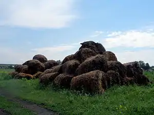 Применение всех названных приспособлений уместно также в ненастную погоду; дождевая вода легко скатывается с поверхности навешанного на них сена, причём оно не загнивает, если пробудет на козлах не только несколько дней, но даже (например, клевер) и несколько недель; хотя при этом бывает, что верхний слой сена несколько и побелеет, зато внутри оно остается совершенно неиспорченным, с прекрасным зелёным цветом; кроме того, так как сено не лежит на земле, а под ним остается пустое пространство, то оно повреждается меньше, чем в копнах. Во многих случаях, однако, нельзя прибегать к устройству козел или пирамид или из-за дороговизны леса, или ввиду мелкости травы (растущей, напр., на суходольных лугах), которая не держится на перекладинах и сдувается ветром на землю; тогда ограничиваются при ненастной погоде складыванием сено в кучи, которое в значительной степени предохраняет его от выщелачивания дождями. Это показывает уже самый простой расчёт. Очевидно, что сено, сложенное в кучи, займет значительно меньшее пространство, чем если бы оно было оставлено в прокосах или разбросано по лугу, и следовательно, оно во столько же раз меньше примет в себя дождевой воды и во столько же раз будет выщелочено менее; кроме того, потеря от выщелачивания уменьшается ещё тем, что часть таких веществ с поверхности будет всасываться сеном, лежащим внутри копны.