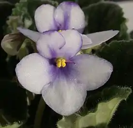 - Saintpaulia 'Chimera Monique' — цветки этого сорта имеют сиреневые лепестки с белой каймой.