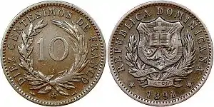 - доминиканский сентесимо — в 1891—1897 годах 1⁄100 доминиканского франка;