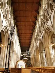 Внутренне убранство отличалось сдержанностью и строгостью, скульптуры почти отсутствовали. Стены были оштукатурены и раскрашены там, где не украшены яркими гобеленами. Скульптурные украшения были добавлены позднее, в XII веке, когда они вошли в моду в эпоху готической архитектуры. От нормандских времён сохранились аркады под центральной башней и на северной стороне нефа, остальное — готика средневековая и викторианская.