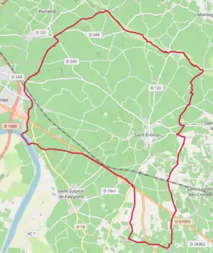 Согласно декрету от 14 ноября 1936 года, винодельческое производство территориально ограничено рамками исторической границы Сент-Эмильона, утвержденной королём Англии Эдуардом I в 1289 году. Оно охватывает восемь муниципалитетов Сент-Эмильона и одну часть соседнего муниципалитета Либурн: