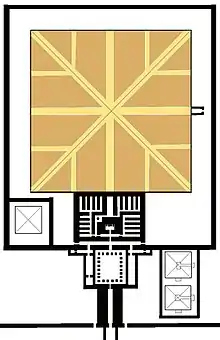 Пирамида была окружена каменной стеной, частично дошедшей до наших дней. Внутри ограждения располагалась пирамида-спутник и внутренняя часть заупокойного храма. Ограда пирамиды заслуживает отдельного внимания. Высотой 5 м, шириной 2 м, эта стена через постоянные интервалы была украшена как с внутренней, так и с внешней стороны монументальными рельефами в метр шириной в виде царского имени Хора (серех). Ритуальная пирамида, располагающаяся в юго-восточном углу внутренней ограды, имела основание 21 × 21 метр и достигала в высоту 19 метров. Это была последняя культовая пирамида, возведённая фараонами. В дальнейшем, видимо, ритуальные пирамиды больше не строились. Как и в ансамбле Аменемхета I, комплекс окружала вторая стена из сырцового кирпича. За ней находилась открытая часть заупокойного храма и девять пирамид небольшого размера, принадлежавших царской семье. Каждая из них имела собственный заупокойный храм и стену ограждения.