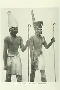 Недалеко от пирамиды располагалась гробница верховного жреца Иуну (Гелиополя) по имени Имхотеп. Он занимал должность начальника всех работ и, возможно, руководил строительством пирамиды. В небольшой камере, расположенной в толще сложенной из кирпича-сырца стены гробницы были обнаружены две прекрасные статуи царя, вырезанные из кедрового дерева. При этом на голове первого изваяния — белая корона Верхнего Египта, а другого — красная корона Дельты.