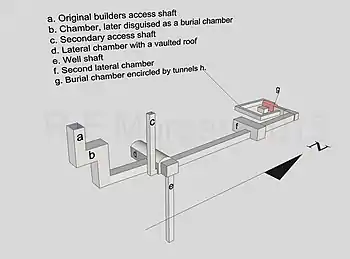 При её строительстве исключительное внимание уделялось мерам предосторожности против грабителей. Вход в пирамиду, расположенный с южной стороны (прежде он устраивался на северной стороне пирамиды), на некотором расстоянии он неё, представлял собой высеченный в скале колодец (исключительный случай в конструкции пирамиды). Все внутренние помещения и проходы были вырублены в толще твёрдой скалы, под кирпичной и каменной кладкой. Подземные коридоры превратили в лабиринт с колодцами-западнями, погребальную камеру поместили примерно в 20 метрах сбоку от центра основания, где она согласно обычаю должна находиться, и на глубине 12 м. Этот сложный план позволяет предположить, что строители воспользовались более древним захоронением, приспособив его внутреннюю структуру для защиты от разграбления. От входа две глубокие перпендикулярные шахты вели в туннель или проход, поднимавшийся под небольшим углом вверх. В результате исключалась угроза его затопления дождевой водой, которая могла просочится через шахты. В конце этого прохода находилось обширное помещение, вырубленное в скале и затем облицованное известняком. Через него можно было попасть в настоящую погребальную камеру, облицованную красным гранитом.
