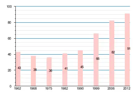 | 1962 | 1968 | 1975 | 1982 | 1990 | 1999 | 2004 | 2006 | 2008 | 2009 | 2011 | 2012 |