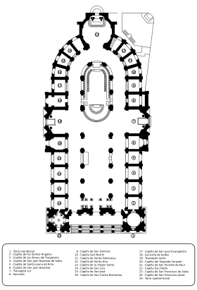 Проект Сервандони предусматривал две башни, соединенные двухъярусным портиком, оформленным колоннами (внизу дорического, вверху ионического ордера). Симметричные башни фасада должны были быть увенчанными по-барочному вогнутыми шатрами со статуями, а двухъярусная колоннада-лоджия на палладианский манер — иметь треугольный фронтон, также украшенный рельефами и статуями. Всё это придавало бы композиции более барочный характер, но не было реализовано. Башни несколько отличаются друг от друга. Но даже с учётом этих утрат фасад Сервандони выглядит внушительно и элегантно.