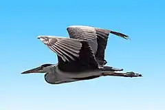Летящую цаплю нетрудно отличить от других крупных птиц. Она складывает шею в виде латинской буквы S, так что голова оказывается на спине, и вытягивает ноги далеко за обрез хвоста. В таком положении силуэт имеет горбатый вид, с выпирающим выступом, образованным изгибом шеи. В сравнении с цаплей, у аистов и журавлей, в частности у аналогично окрашенного серого журавля, шея прямая и голова далеко выступает от остальной части тела. При взлёте цапля, особенно вспугнутая, делает быстрые взмахи крыльями, при этом ноги болтаются в воздухе. Взлетев достаточно высоко, птица переходит на медленный и плавный полёт, с размеренными движениями крыльев. Изредка она пари́т. Голос цапли обычно слышится именно на лету. Во время полёта группы цапель часто образуют клин или линию[11][13].